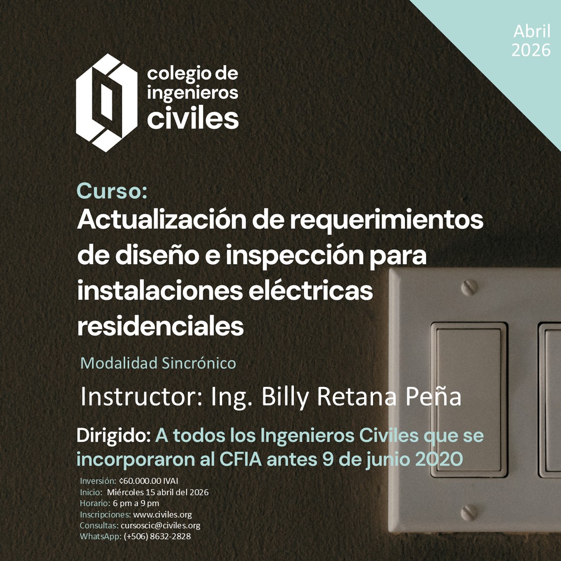 Dirigido a:Profesionales en Ingeniería Civil, Ingeniería en Construcción o Arquitectura que requieran acreditar una actualización profesional sobre sistemas eléctricos en cumplimiento con el Reglamento para el trámite de planos y la conexión de los servicios eléctricos vigente, que se hayan incorporado al CFIA antes 9 de junio 2020. Curso obligatorio para poder tramitar planos eléctricos con un área máxima de 80 m2 o 18 KW